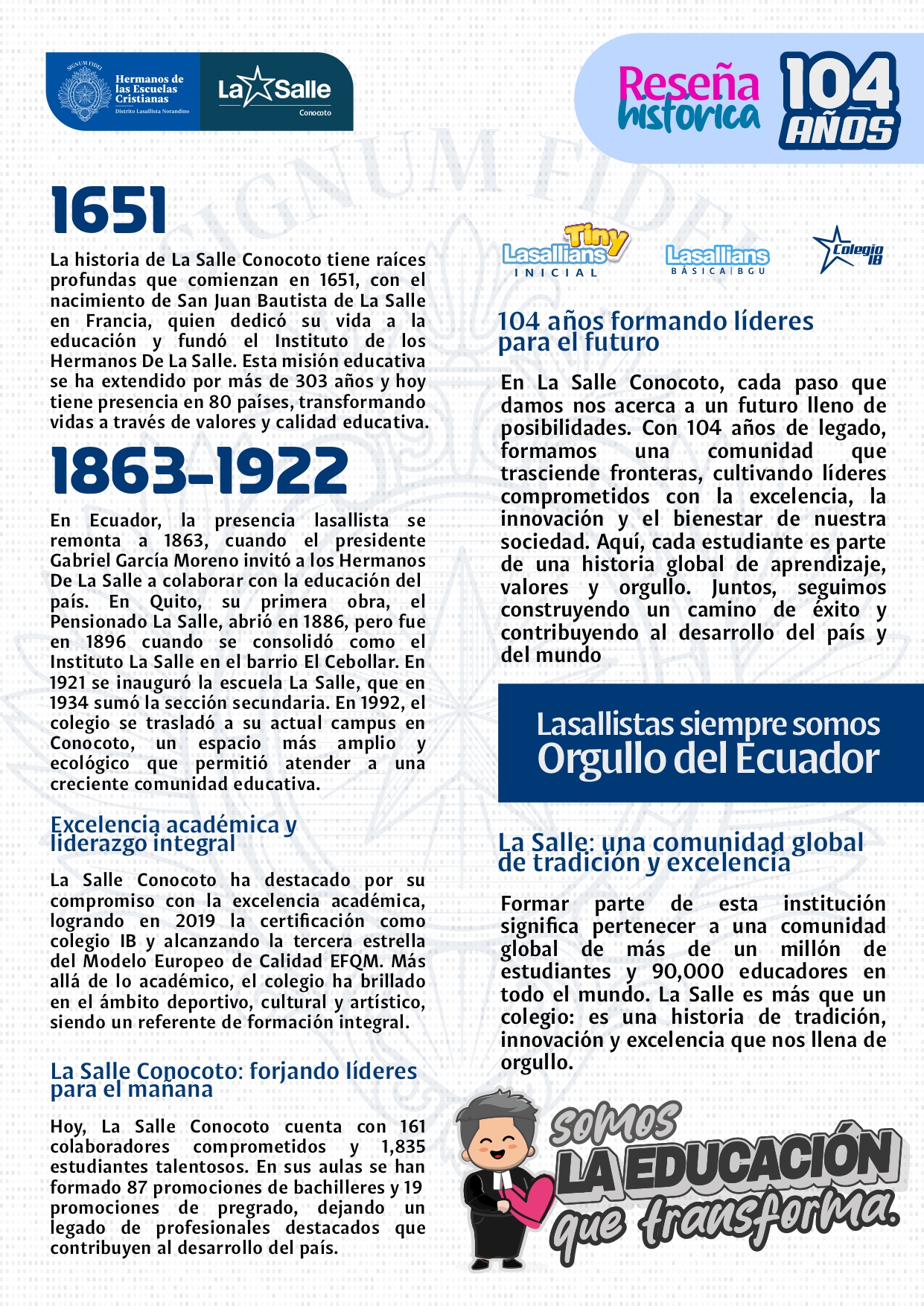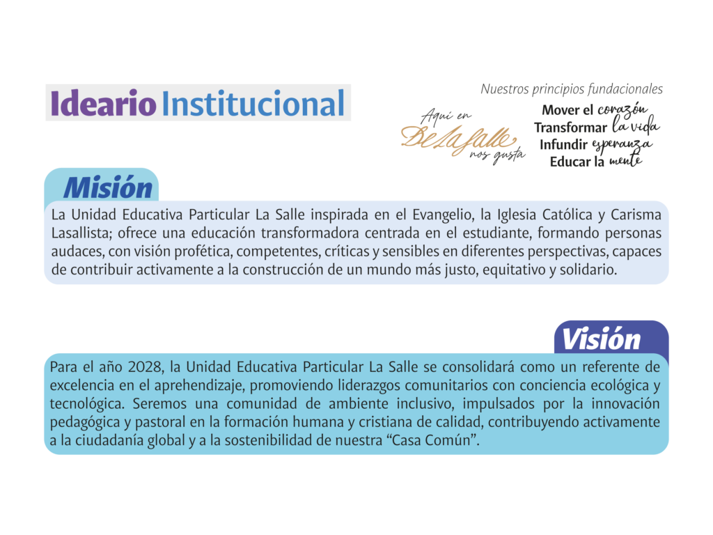 Con una mirada estratégica que permita generar cambios profundos y aportar sistemáticamente a construir una mejor sociedad, en la Unidad Educativa Particular La Salle ejecutamos procesos con base en el contexto sociofamiliar, socio educativo y de la Red La Salle en el mundo.