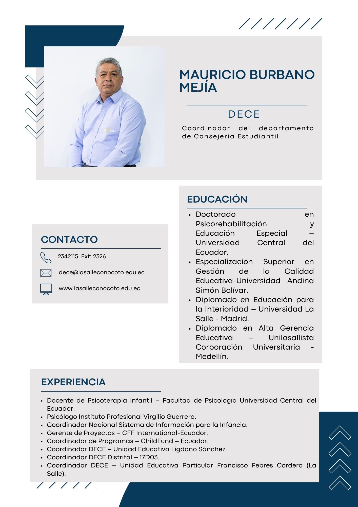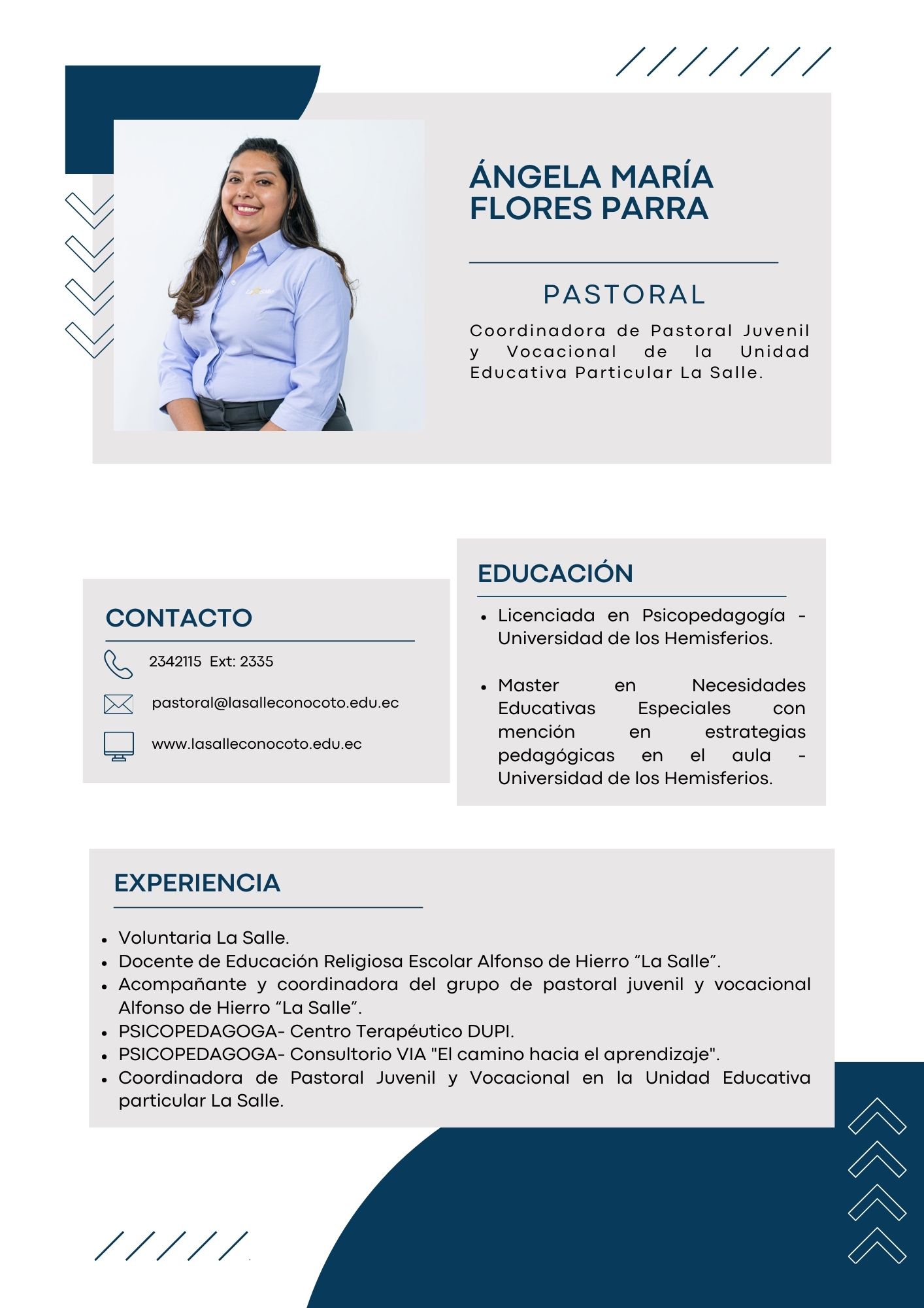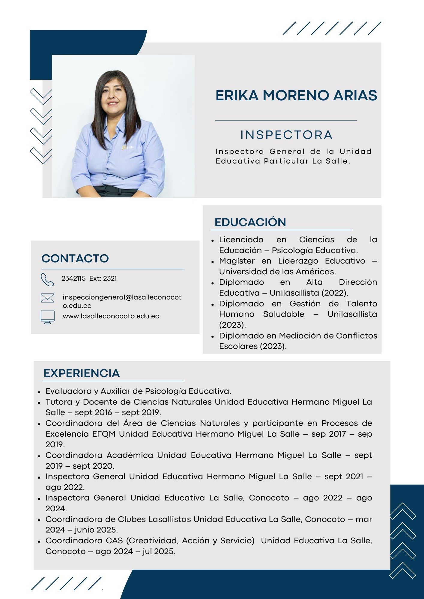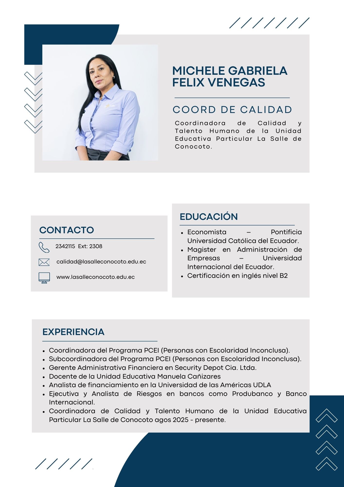 El Equipo Líder está conformado por personas profundamente comprometidas con su desarrollo integral, en permanente búsqueda de la plenitud humana y espiritual. Cada integrante encarna los valores cristianos, haciendo de su vida cotidiana un testimonio vivo de fe, fraternidad y servicio, según los principios que inspiran la identidad y espiritualidad lasallista.