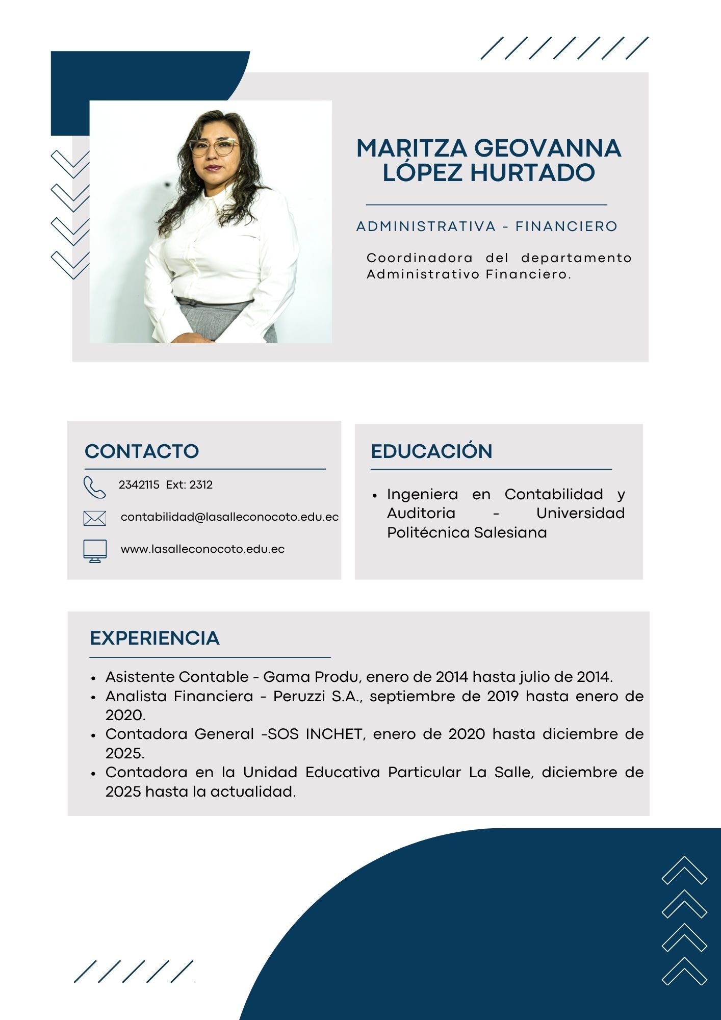El Equipo Líder está conformado por personas profundamente comprometidas con su desarrollo integral, en permanente búsqueda de la plenitud humana y espiritual. Cada integrante encarna los valores cristianos, haciendo de su vida cotidiana un testimonio vivo de fe, fraternidad y servicio, según los principios que inspiran la identidad y espiritualidad lasallista.